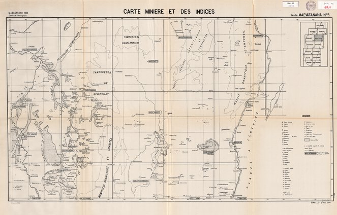 Title: Carte minière et des indices de Madagascar, Feuille Maevatanana n°5 - Scale: 500000 - Assemblage de 13 feuilles - Sheet number/Numéro de feuille/Bladnummer: 5