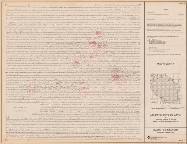 Title: Airborne Geophysical Survey for The United Republic of Tanzania, Ministry of Water, Energy and Minerals, Uranium (Bi 214) radiation Intensity profiles - Scale: 100000 - Minute - Sheet number/Numéro de feuille/Bladnummer: 54