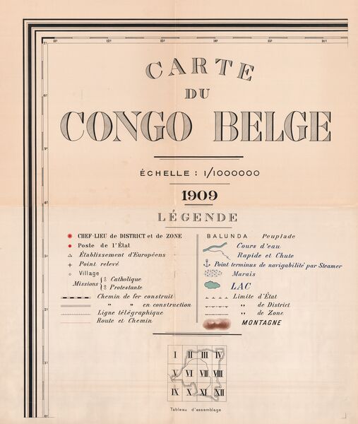 Title: Carte du Congo Belge - Scale: 1000000 - Tableau d'assemblage (12 feuilles) Feuille I - Sheet number/Numéro de feuille/Bladnummer: I