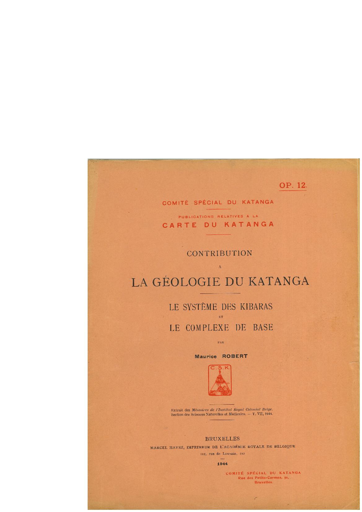 Title: Contribution à la géologie du Katanga - Le système des Kibaras et le complexe de base, Notice explicative OP. 12 - Extrait des "Mémoires de l'Institut Royal Colonial Belge" Section des Sciences Naturelles et Médicales - T. VII, 1944 N° Réf. 2019