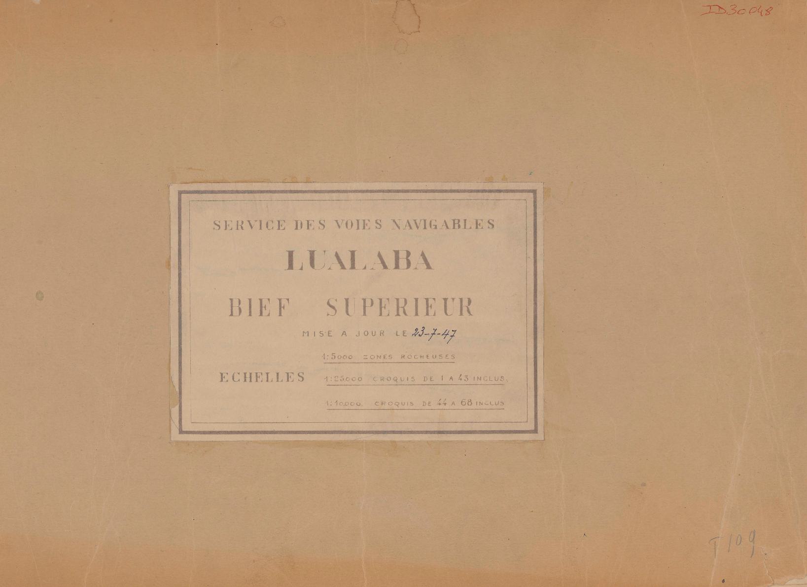 Title: Lualaba Bief Superieur - Scale: 25000 - Mise à jour le 23-7-47 Echelles : 1:5000 zones rocheuses 1:25000 croquis de 1 à 43 inclus 1:10000 croquis de 44 à 68 inclus