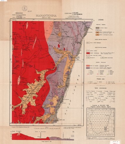 Title: Carte géologique de reconnaissance, Manantenina - Scale: 200000 - Sheet number/Numéro de feuille/Bladnummer: F.G. 62-63 ( 608 )