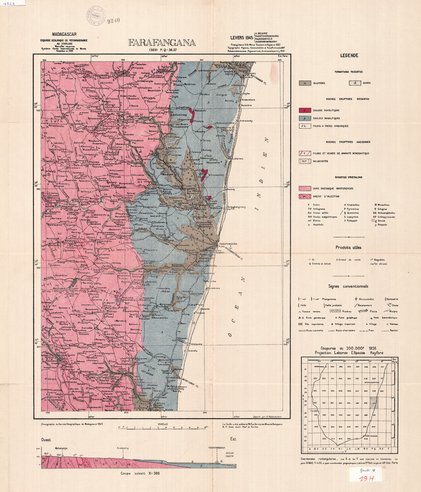 Title: Carte géologique de reconnaissance, Farafangana - Scale: 200000 - Sheet number/Numéro de feuille/Bladnummer: P.Q. 56-57 ( 569 )