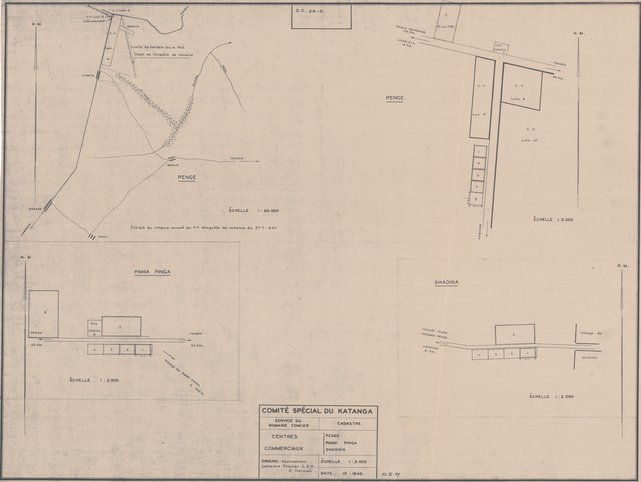 Title: Centres commerciaux Penge - Piani Pinga - Shadika Abornement - Cadastre foncier - Scale: 2000 - Date : IX - 1945 Date (révision) : 12-II-1949 Service du domaine foncier