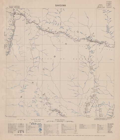 Title: Bakouma, Croquis provisoire - Scale: 200000 - Ce document, dressé en vue de la révision des croquis au 1:1.000.000ème de l'Afrique Française, a été établi en grande partie par renseignements, publié en attendant les levers réguliers, il ne doit en aucun cas être considéré comme une carte régulière - Sheet number/Numéro de feuille/Bladnummer: NB-34-XI