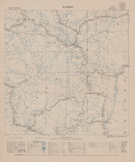 Title: Alindao, Croquis provisoire - Scale: 200000 - Ce document, dressé en vue de la révision des croquis au 1:1.000.000ème de l'Afrique Française, a été établi en grande partie par renseignements, publié en attendant les levers réguliers, il ne doit en aucun cas être considéré comme une carte régulière - Sheet number/Numéro de feuille/Bladnummer: NB-34-VII