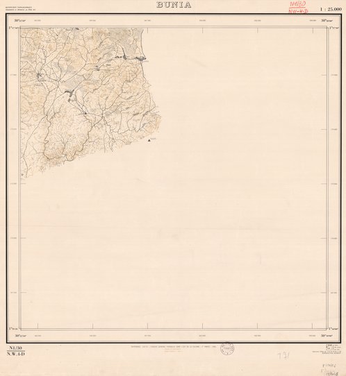 Title: Bunia - Scale: 25000 - Restitution topographique Planimétrie et altimétrie au Wild A6 - Sheet number/Numéro de feuille/Bladnummer: N1/30-NW4D