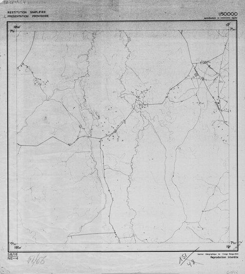 Title: Kahemba Ouest - Scale: 50000 - Restitution Simplifiée Présentation Provisoire - Sheet number/Numéro de feuille/Bladnummer: S8/18 NE4