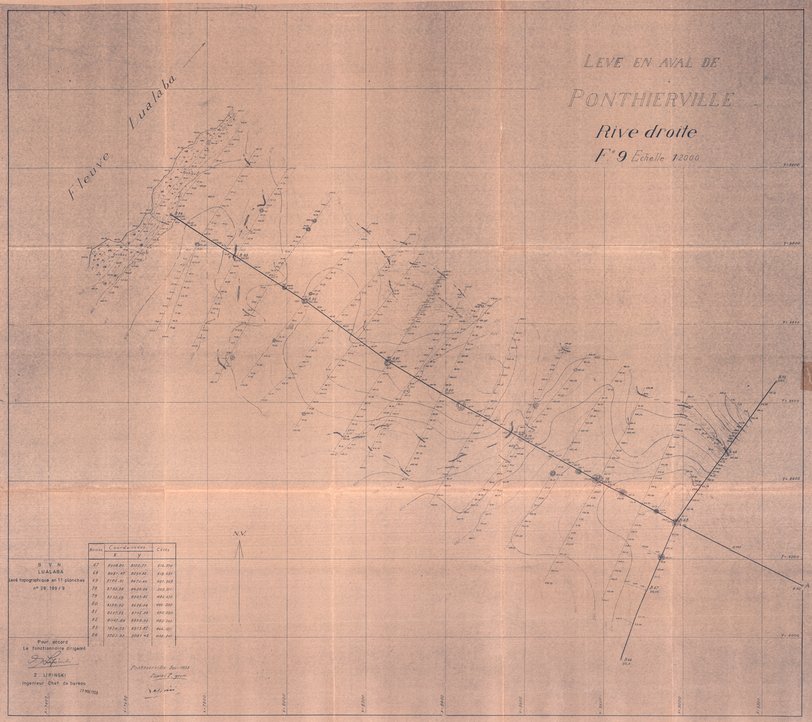Title: Levé en aval de Ponthierville, Rive droite F9 - Scale: 2000 - Ponthierville - Dec. 58 Levé topographique en 11 planches - Sheet number/Numéro de feuille/Bladnummer: 39.199/9