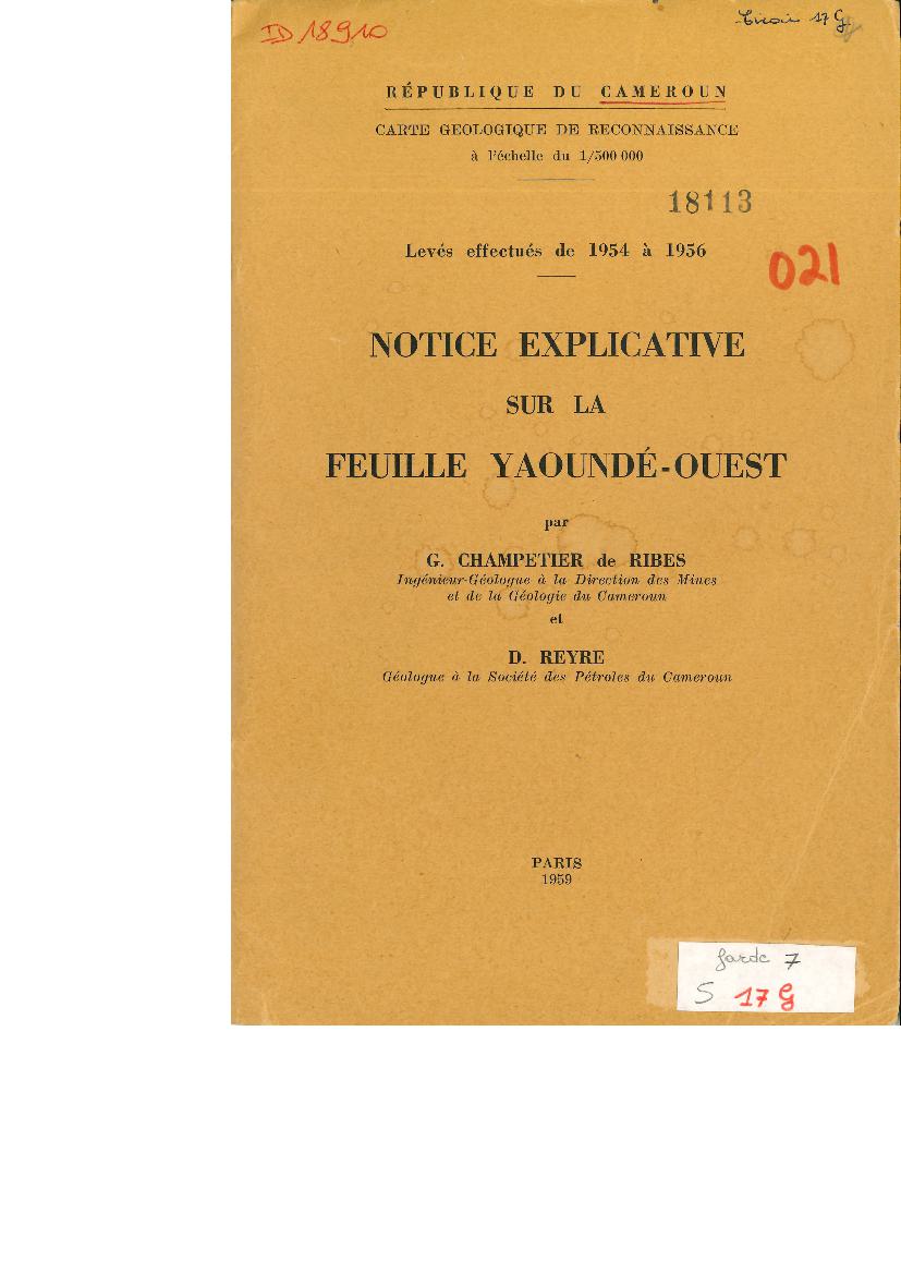 Title: Carte géologique de reconnaissance du Cameroun, Notice explicative sur la feuille de Yaoundé-Ouest - Scale: 500000 - Sheet number/Numéro de feuille/Bladnummer: NA 32 NE-O 21