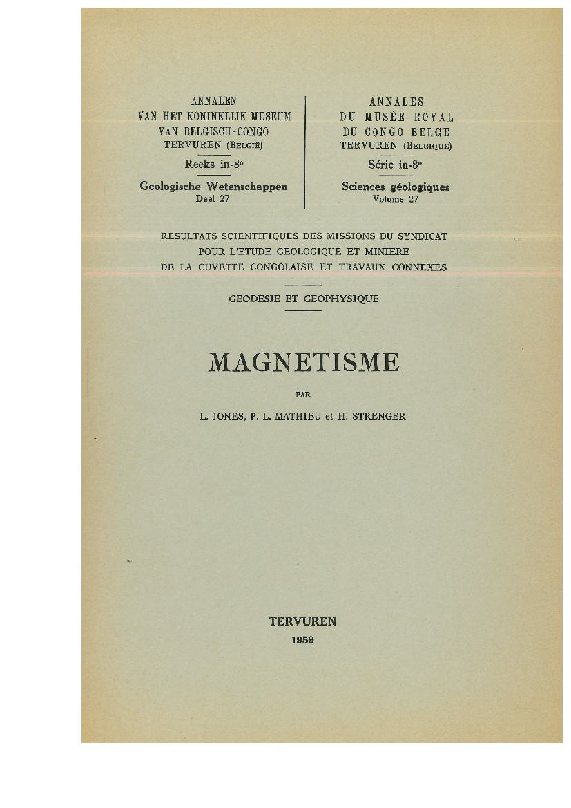 Title: Magnétisme, Résultats scientifiques des missions du Syndicat pour l'étude géologique et minière de la cuvette congolaise et travaux connexes - Scale: 2000000 - Annales du Musée Royal du Congo Belge, Tervuren Série 8 Sciences géologiques Volume 27 - Sheet number/Numéro de feuille/Bladnummer: 27
