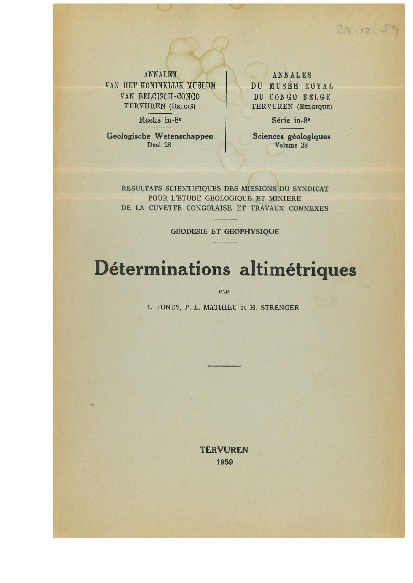 Title: Déterminations altimétriques, Résultats scientifiques des missions du Syndicat pour l'étude géologique et minière de la cuvette congolaise et travaux connexes - Scale: 2000000 - Annales du Musée Royal du Congo Belge, Tervuren Série 8 Sciences géologiques Volume 28 - Sheet number/Numéro de feuille/Bladnummer: 28