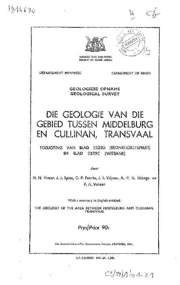 Title: Die geologie van die gebied tussen Middelburg en Cullinan, Transvaal, Toeligting van blad 2528D (Bronkhorstspruit) en blad 2529C (Witbank) - Scale: 125000 - Sheet number/Numéro de feuille/Bladnummer: 2528D-2529C