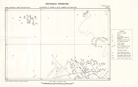 Title: Bompata NW Geochemical prospecting Distribution of copper in active sediments and bank soils, Ghana Geological Survey Bulletin N°31 Map 21 - Scale: 62500 - Preliminary series