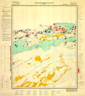 Title: Alger Nord, Carte des Gites Minéraux de l'Algérie - Scale: 500000 - Tableau d'assemblage de 4 cartes