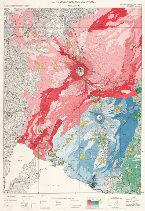 Title: Afrique Centrale Feuille 1, Carte volcanologique des Virunga - Scale: 50000 - Missions géologiques et géophysiques aux Virunga Chef de mission Nyiragongo 1959 : P. Evrard Découpage de la région des Virunga en trois feuilles - Sheet number/Numéro de feuille/Bladnummer: 1