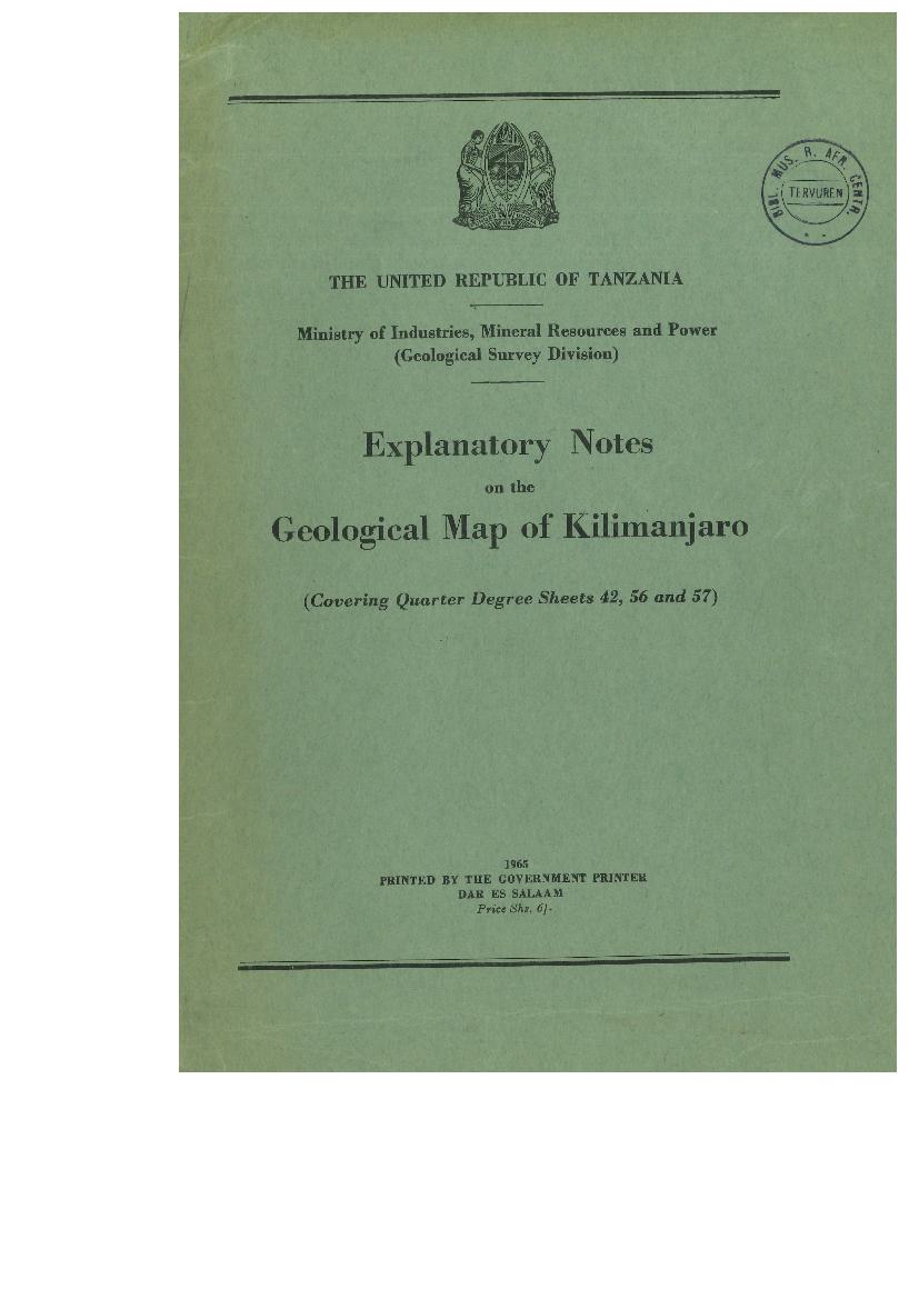 Title: Geological map series : 1/125000, Kilimanjaro-Moshi - Scale: 125000 - Special Sheet Covering Quarter Degree sheets 42, 56 and 57 - Sheet number/Numéro de feuille/Bladnummer: 42-56-57