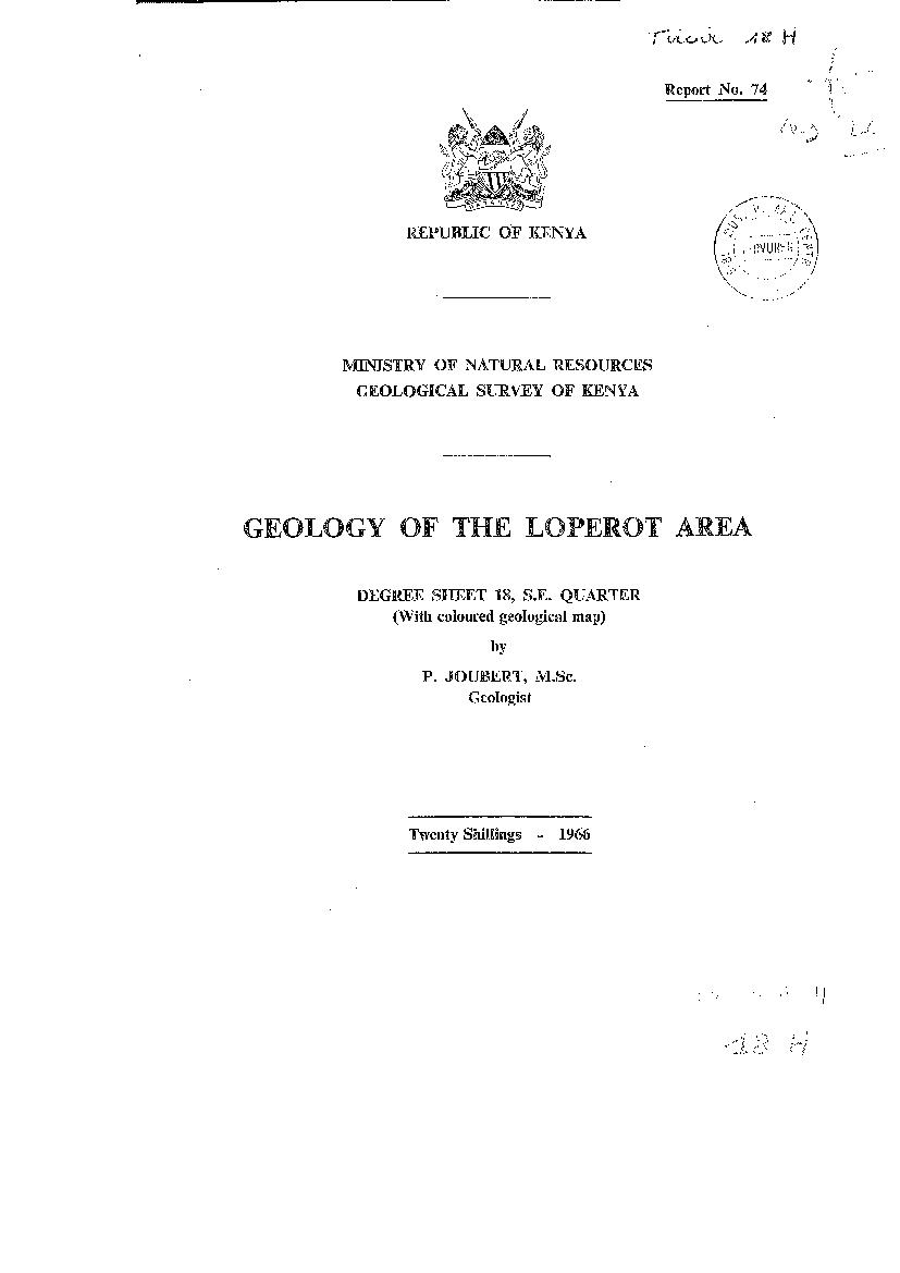 Title: Geology of the Loperot Area, Report N°74 - Scale: 125000 - Geological map series : 1/125000 Directorate of Overseas Surveys Sheet 51 - Sheet number/Numéro de feuille/Bladnummer: 18 S.E.