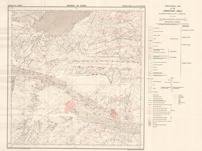 Title: Republic of Zambia, Structural map of the Chinyunu area - Scale: 100000 - Structural map of the Chinyunu area to accompany Report N°19 - Sheet number/Numéro de feuille/Bladnummer: 1529 NW