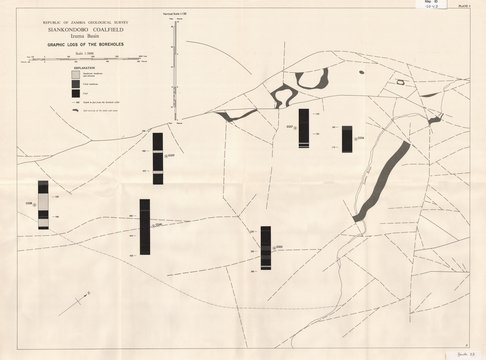 Title: Republic of Zambia, Siankondobo coalfield - Izuma Basin - Graphic logs of the boreholes - Scale: 5000 - Map to accompany Economic Report N°16 Plate 5 - Sheet number/Numéro de feuille/Bladnummer: 5