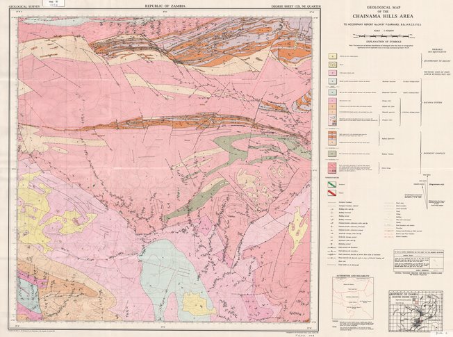 Title: Geological map of the Chainama Hills Area, Republic of Zambia - Scale: 100000 - Map to accompany Report n°24 - Sheet number/Numéro de feuille/Bladnummer: 1528 NE