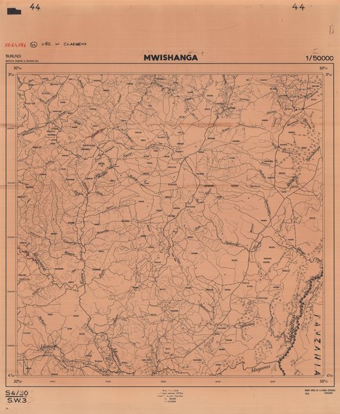 Title: Feuille 44, Mwishanga - Scale: 50000 - Restitution Simplifiée au Stéréotop Zeiss Points d'observation W. Claessens - Sheet number/Numéro de feuille/Bladnummer: S4/30 SW3