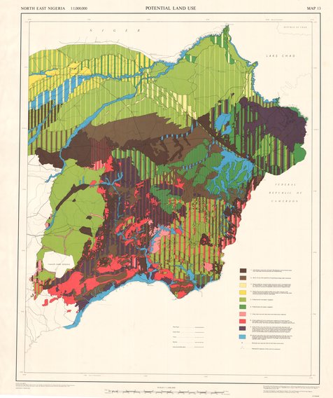 Title: North East Nigeria Potential Land Use - Scale: 1000000 - This map accompanies a Land Resource Study, The Land Resources of North East Nigeria - Sheet number/Numéro de feuille/Bladnummer: 13