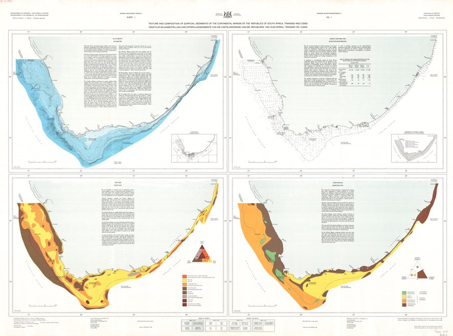 Title: Tekstuur en samestelling van oppervlaksedimente van die vastelandsrand van die Republieke van Suid-Afrika, Transkei en Ciskei, Texture and composition of surficial sediments of the continental margin of the republics of South Africa, Transkei and Ciskei - Scale: 4000000 - Assemblage en 4 feuilles - Sheet number/Numéro de feuille/Bladnummer: 1