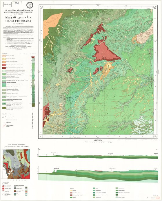 Title: Carte géologique de l'Algérie, Hassi Chebbaba (ex Fort Miribel) - Scale: 200000 - Sheet number/Numéro de feuille/Bladnummer: NH-31-IX