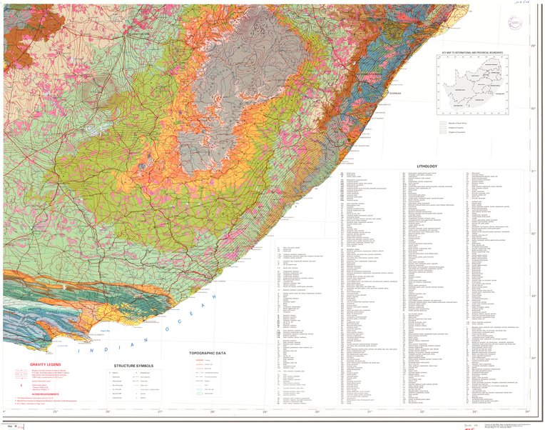 Title: Geological map of the Republic of South Africa, and the kingdoms of Lesotho and Swaziland, Gravity Edition - Scale: 1000000 - Assemblage de 4 feuilles - Sheet number/Numéro de feuille/Bladnummer: SE