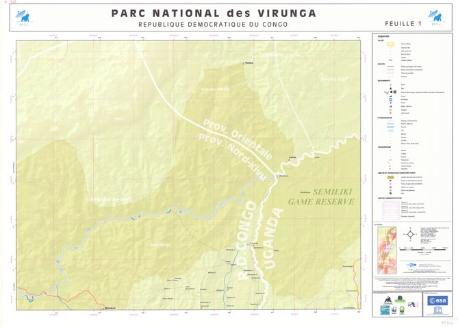 Title: Parc National des Virunga, République Démocratique du Congo - Scale: 50000 - Carte d'assemblage de 21 feuilles - Sheet number/Numéro de feuille/Bladnummer: 1