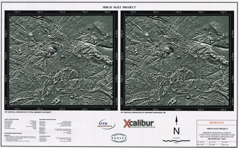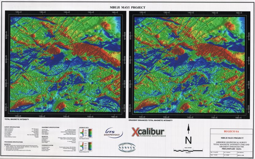 Title: Airborne geophysical survey Total Magnetic Intensity and Gradient Enhanced TMI Preliminary data, Mbuji Mayi Project - Scale: 100000 - ZAI070