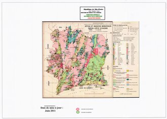 Title: Gîtes et indices minéraux Côte d'Ivoire - Scale: 4000000 - Date de mise à jour : Juin 2011 Autorisation de reconnaissance Autorisation d'exploitation