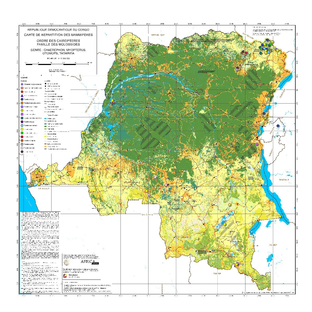 Title: Carte de répartition des mammifères Ordre des Chiroptères Famille des Molossides Genre : Chaerephon, Myopterus, Otomops, Tadarida - Scale: 2500000 - ISBN : 9789492669247
