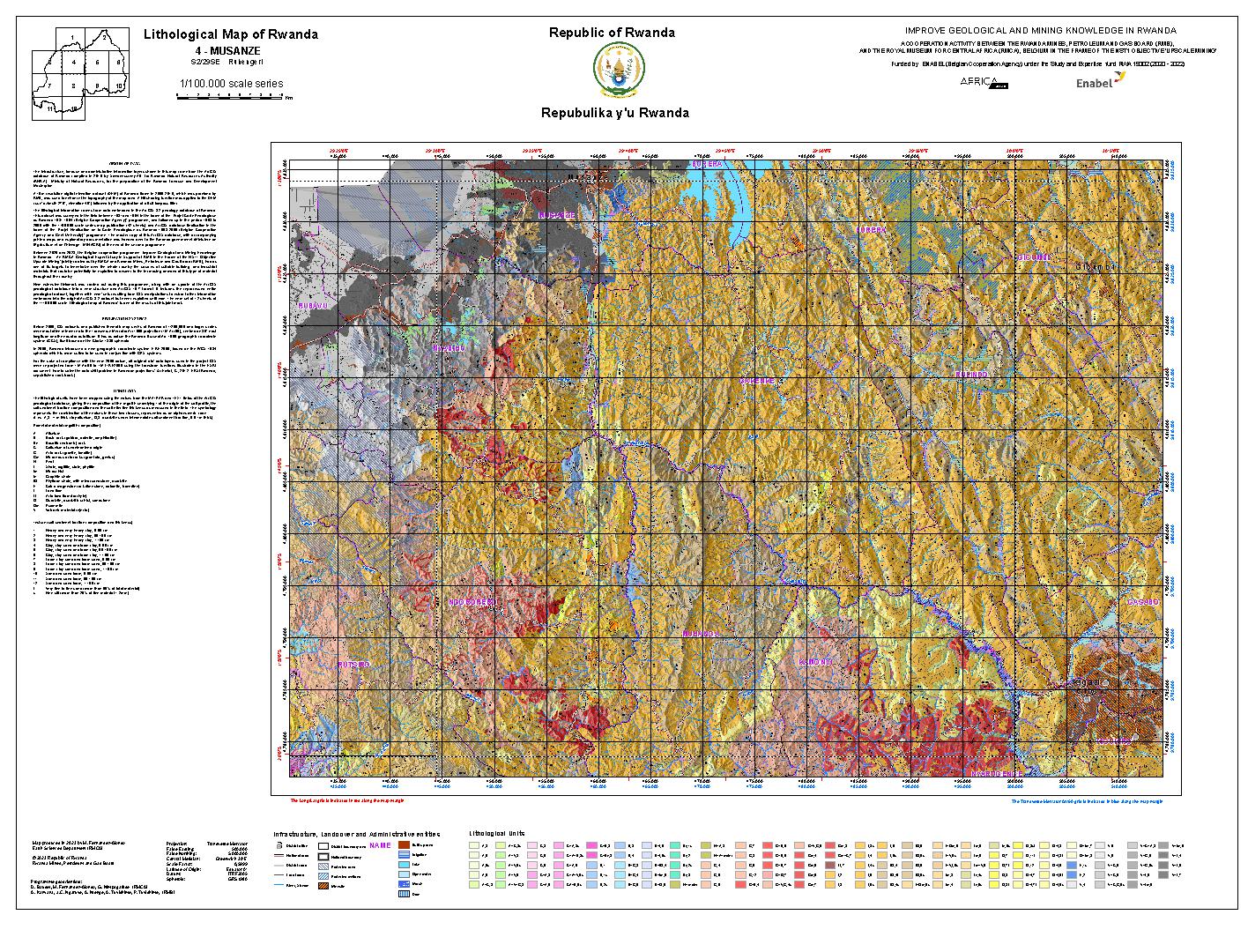 Title: Improve geological and mining knowledge in Rwanda A cooperation activity between the Rwanda Mines, Petroleum and Gas Board (RMB) and the Royal Museum For Central Africa (RMCA), Belgium in the frame of the NST1 objective "upscale mining", Lithological map of Rwanda Musanze S2/29SE Ruhengeri - Scale: 100000 - Assemblage de 12 feuilles Feuille 4 - Sheet number/Numéro de feuille/Bladnummer: S2/29SE