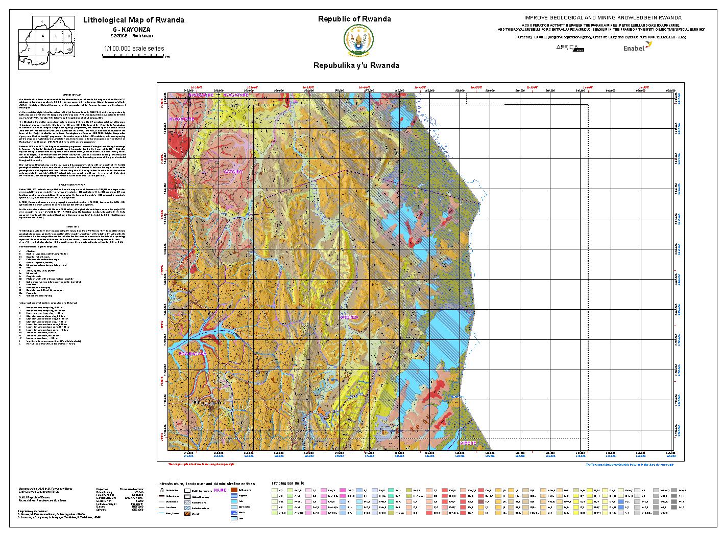 Title: Improve geological and mining knowledge in Rwanda A cooperation activity between the Rwanda Mines, Petroleum and Gas Board (RMB) and the Royal Museum For Central Africa (RMCA), Belgium in the frame of the NST1 objective "upscale mining", Lithological map of Rwanda Kayonza S2/30SE Rwinkwavu - Scale: 100000 - Assemblage de 12 feuilles Feuille 6 - Sheet number/Numéro de feuille/Bladnummer: S2/30SE