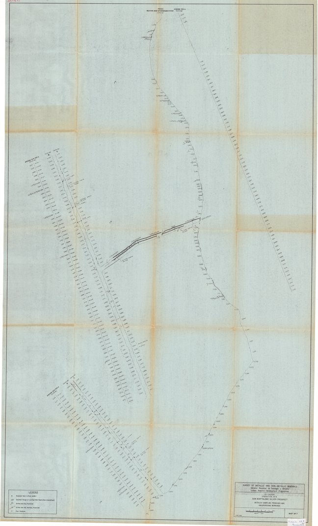 Title: San Bartolome Silver prospect Detailed sampling trenches and underground workings, United Nations Development Programme Operation N°5 - Scale: 100 - Sheet number/Numéro de feuille/Bladnummer: 7