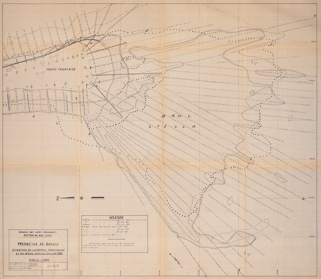 Title: Presqu'île de Banana, Situation de la pointe française et du banc Stella Section du Bas-Congo - Scale: 1000 - Sondages - Sheet number/Numéro de feuille/Bladnummer: 2219/5