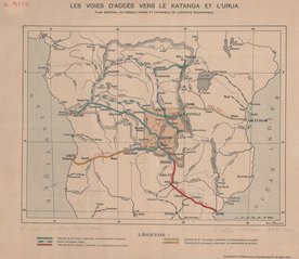 Title: Les voies d'accès vers le Katanga et l'Urua Plan général du réseau ferré et navigable de l'Afrique Equatoriale - Scale: 14700000 - Minute : annotations Supplément au "Mouvement Géographique" du 22 mars 1914