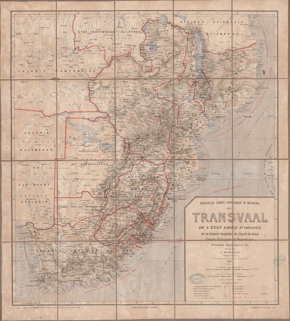 Title: Nouvelle carte physique and minière du Transvaal de l'Etat Libre d'Orange, de la Colonie Anglaise, du Cap et de Natal Colonie Portugaiase de Mozambique, Rhodesia, Nyassaland, etc - Scale: 4350000 - Carte de terrain toilée