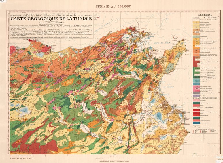 Title: Carte géologique de la Tunisie, Feuille 1 - Scale: 500000 - Carte d'un assemblage de 2 feuilles - Sheet number/Numéro de feuille/Bladnummer: 1