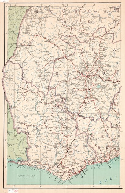 Title: Road map of Ghana, Southern Section - Scale: 500000 - Assemblage en 4 feuilles Feuille SW - Sheet number/Numéro de feuille/Bladnummer: SW