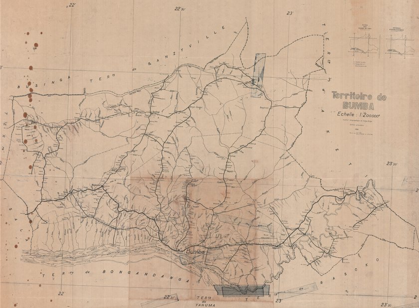 Cette carte du territoire de Bumba en République Démocratique du Congo a été traitée en 1955. Elle délimite cette entité mais aussi elle montre les routes, les principaux centres, les lacs, le parc.