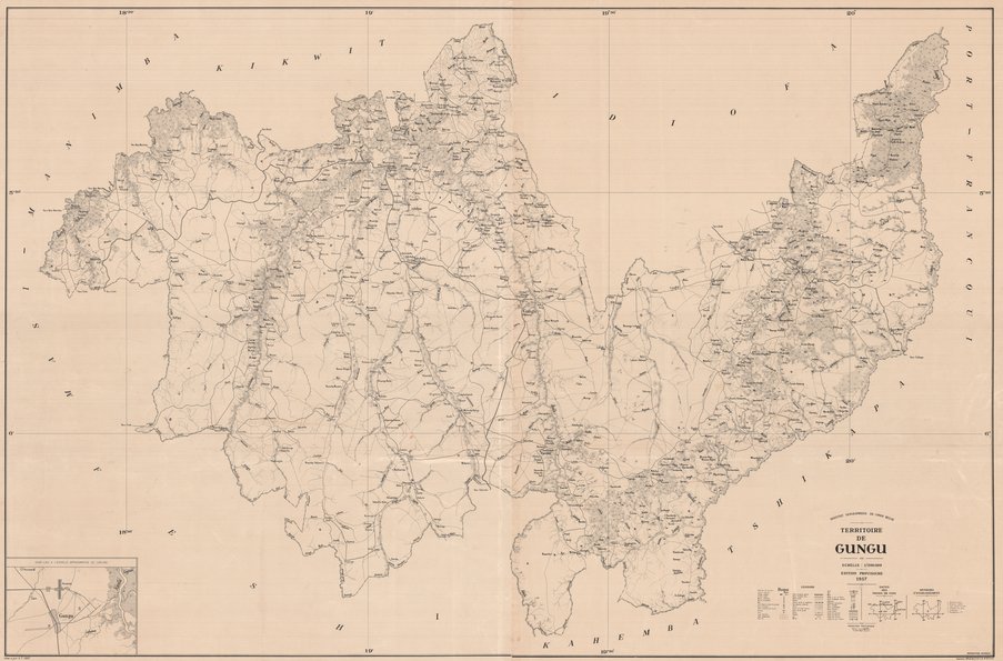 Cette carte livre les informations administratives et à propos des aspects concernat les infrastructures dans le territoire de Gungu en République Démocratique du Congo vers les années 1957.