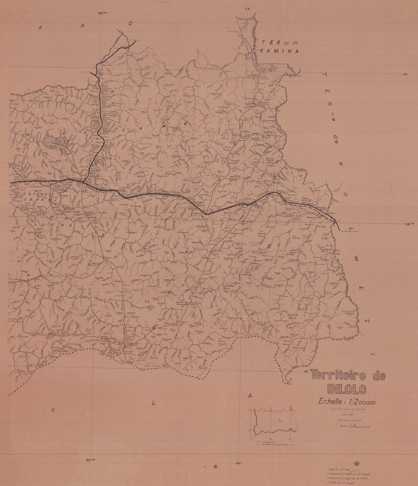 Cette carte indique l'hydrographie, les localités, les chefferies, la végétation, le relief et les voies de communication du Territoire de Dilolo, provinve de Lualaba en République Démocratique du Congo