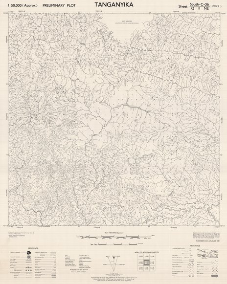 Cette carte indique l'hydrographie, les édifices, les agglomérations et les voies de communication d'une entité au nord-est de Tanganyika en Tanzanie.
