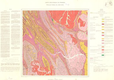 Cette carte indique l'hydrographie ainsi que les données cénozoïques (Holocène et Pléistocène) et précambriennes (burundien), les différentes séries, les successions stratigraphiques, les sigles de formations, les limites géologiques (probables, incertaines), les roches (granitiques et intrusives basiques), les failles en plus des affleurements.