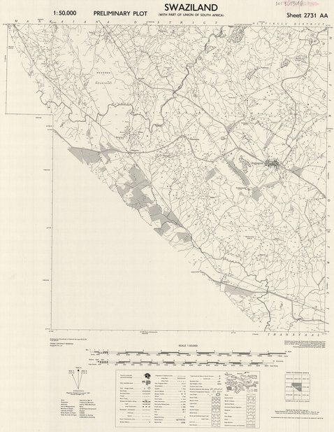 Cette carte livre des renseignements relatifs à la végétation, à l'emplacement de diverses infrastructures (bâtiments, routes, hôpitaux, écoles, églises, temples,...), à des populations, des villes et villages dans une entité de Swaziland vers les années 1954.