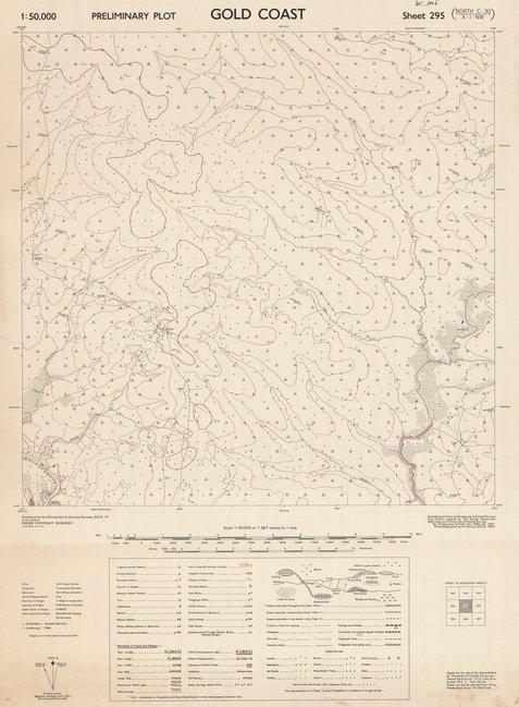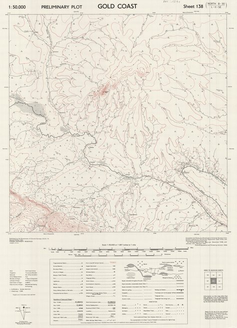 Cette carte livre des renseignements relatifs à la végétation, à l'emplacement de diverses infrastructures (bâtiments), des agglomérations (villes, villages...), des rivières, etc. dans une entité au Ghana à Gold Coast vers les années 1953.