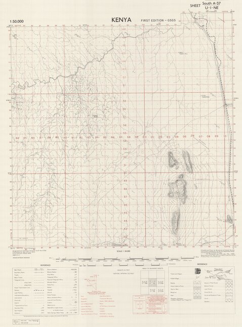Cette carte localise les infrastructures, les routes, les localités, les différentes forêts, les agglomérations dans une partie du Kenya vers les années 1953.